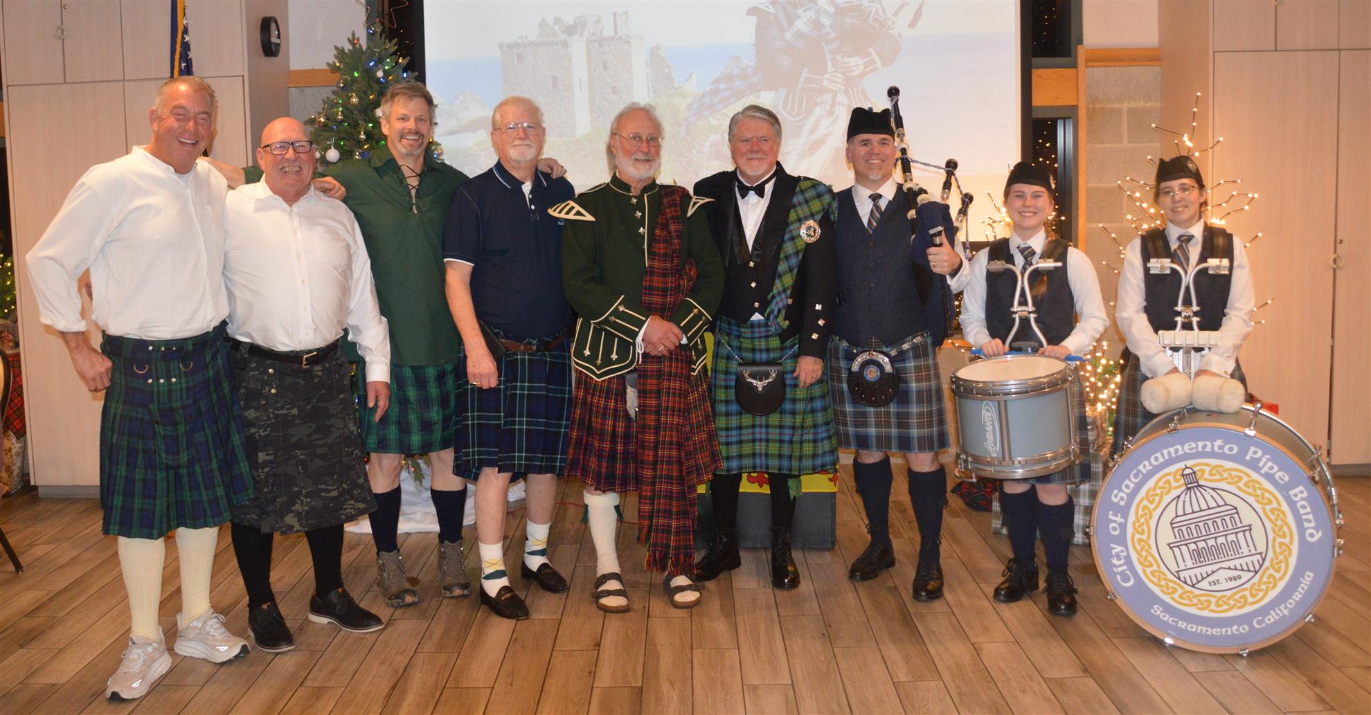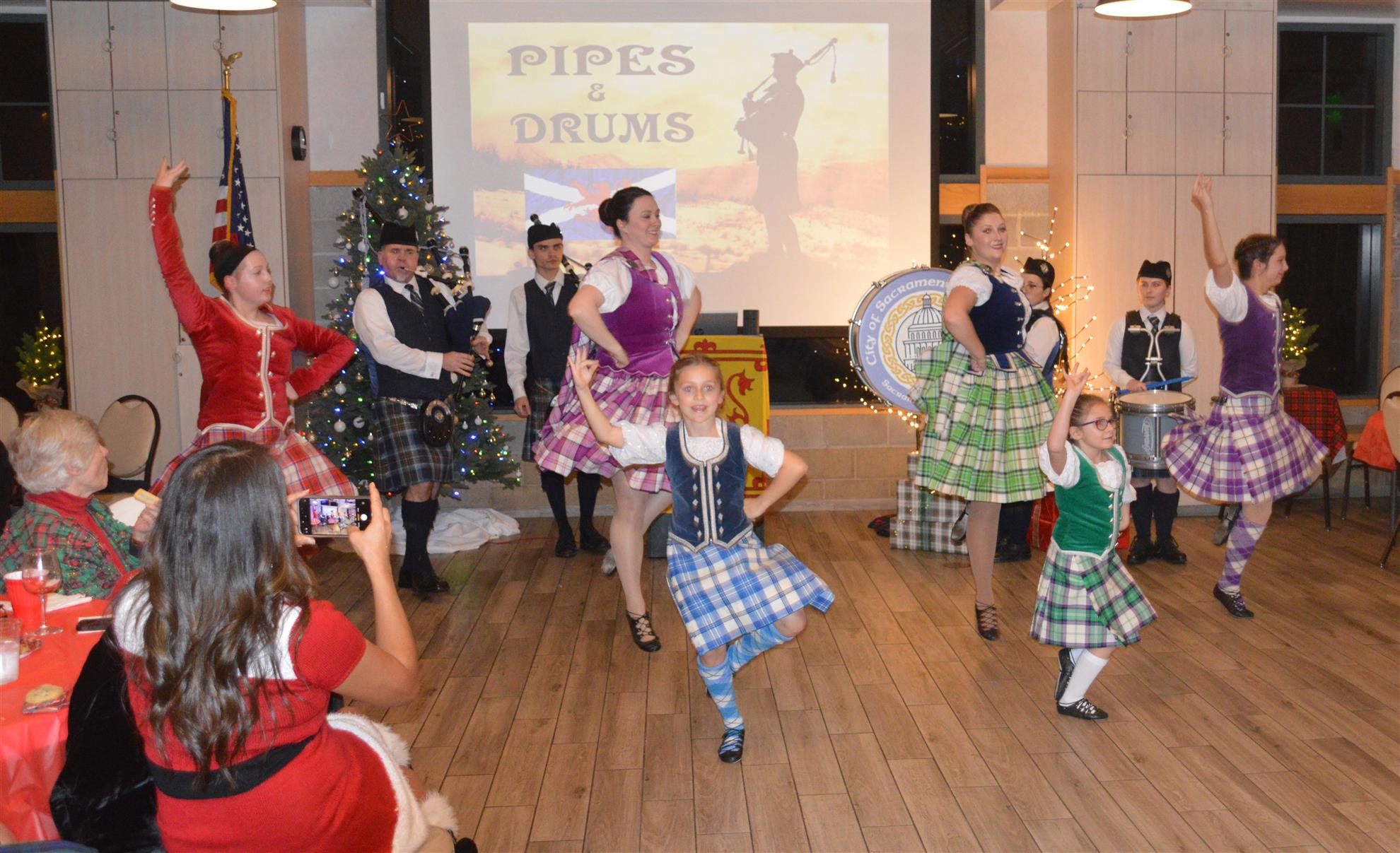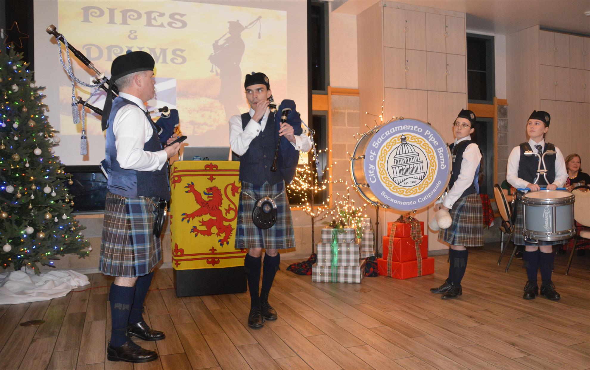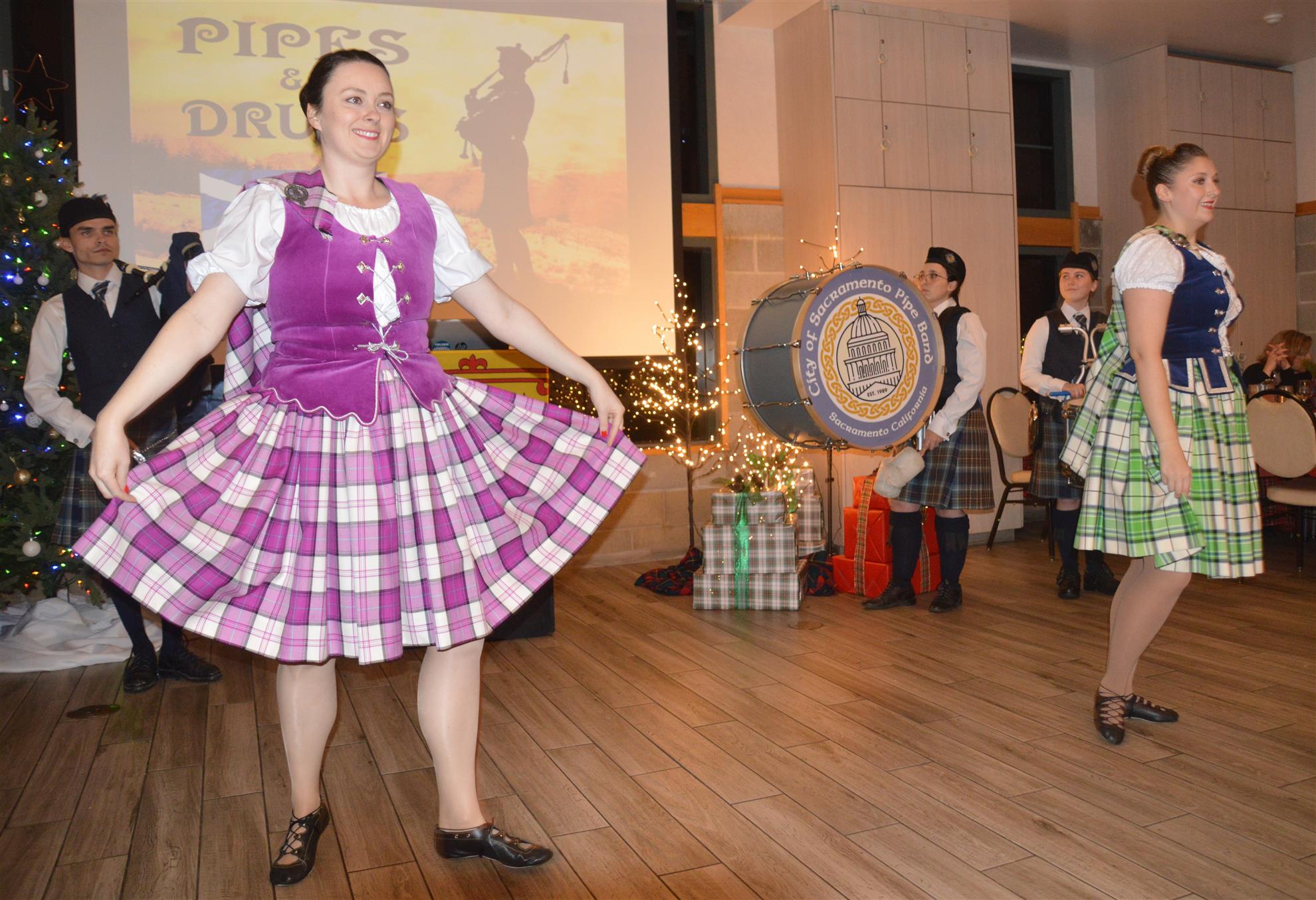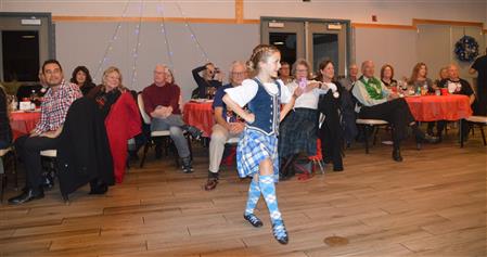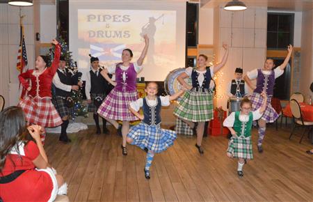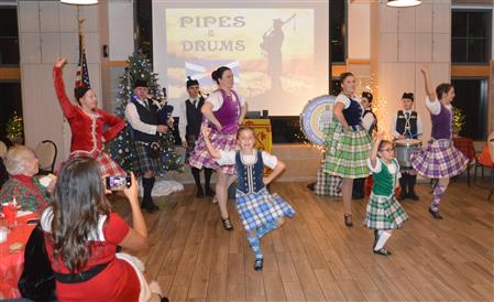 Our meeting on December 18 was our annual Christmas Party. The theme was Scottish Holiday. Members were encouraged to wear their tartans. Entertainment was provided by members of the Sacramento City Pipe Band. After the band and dancers performed, the dancers showed members and guests how to do some Scottish dances.