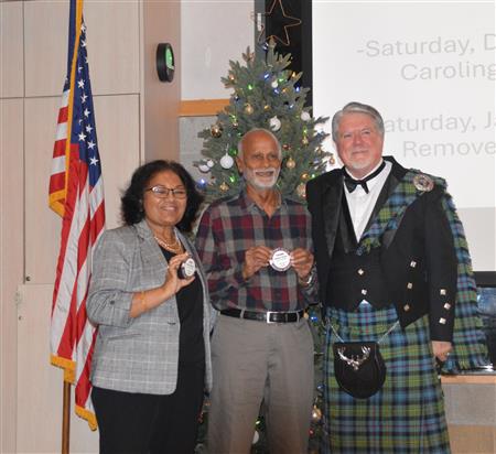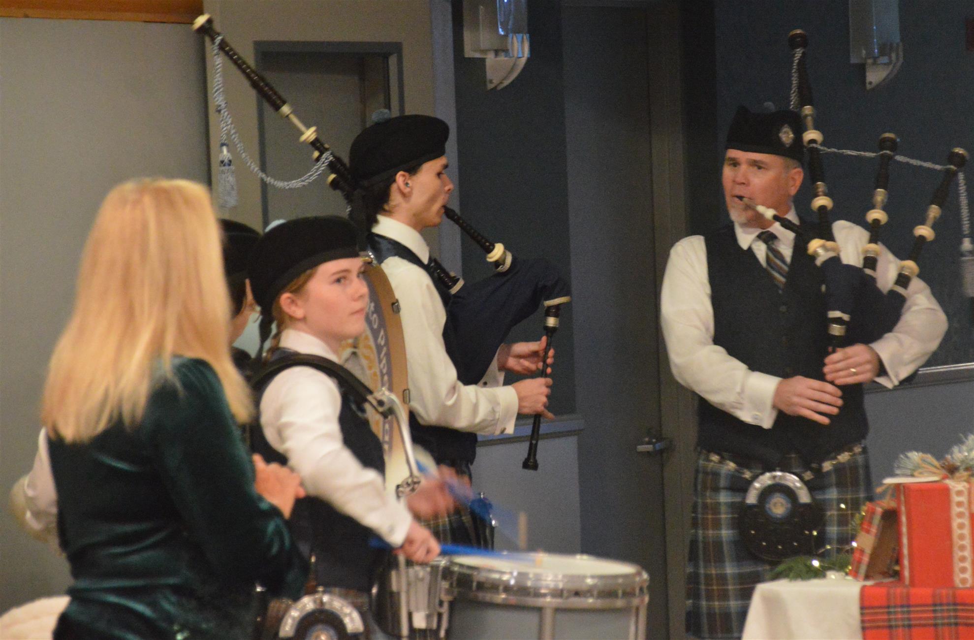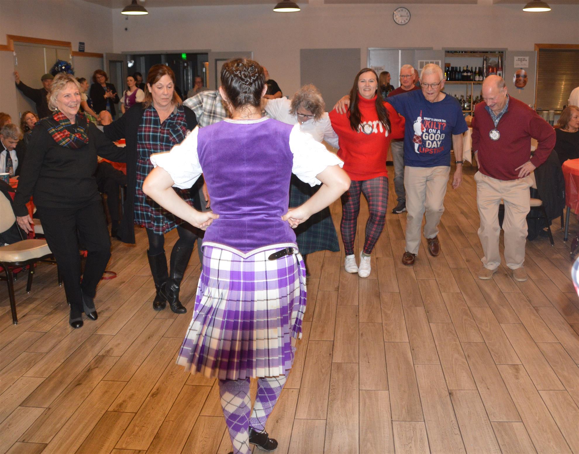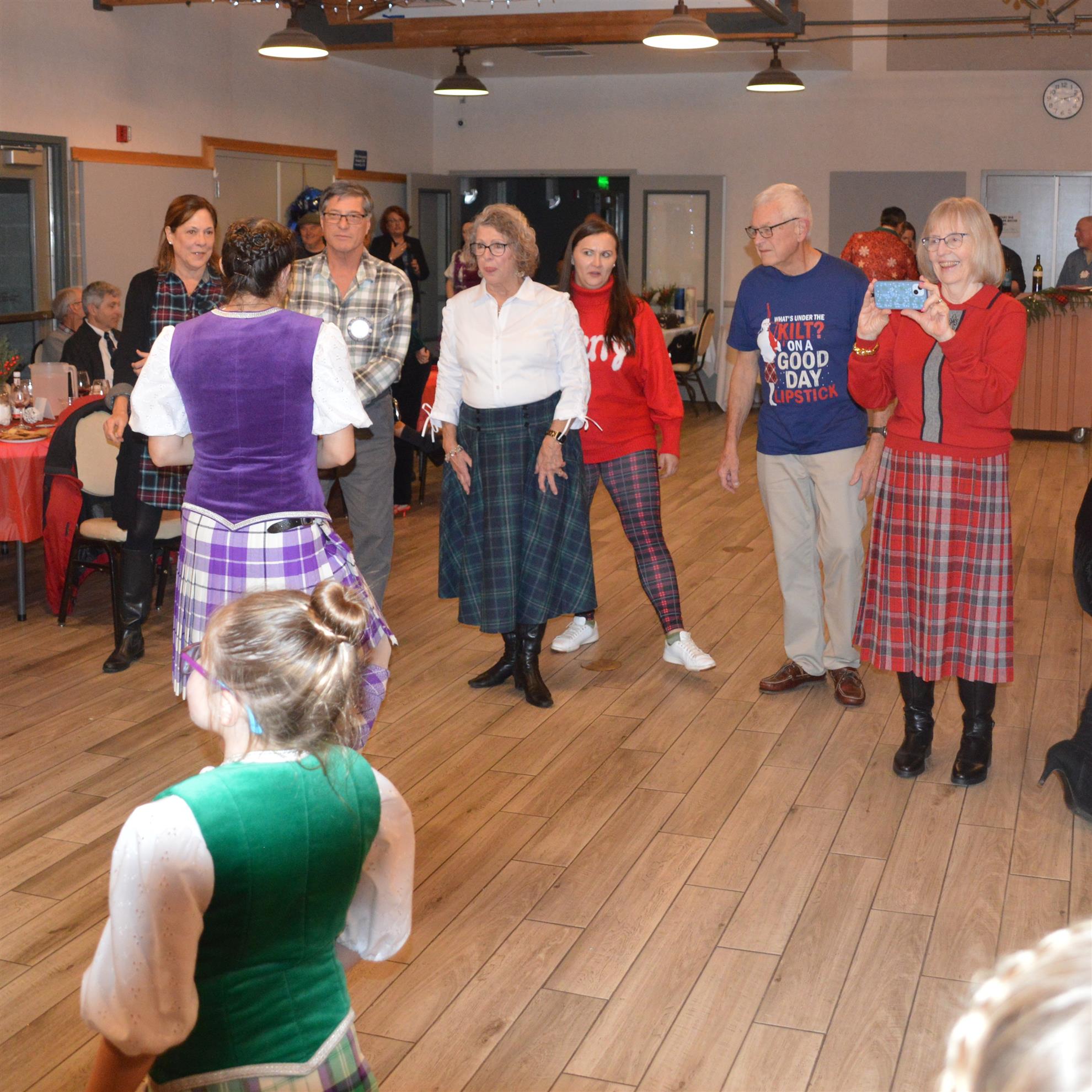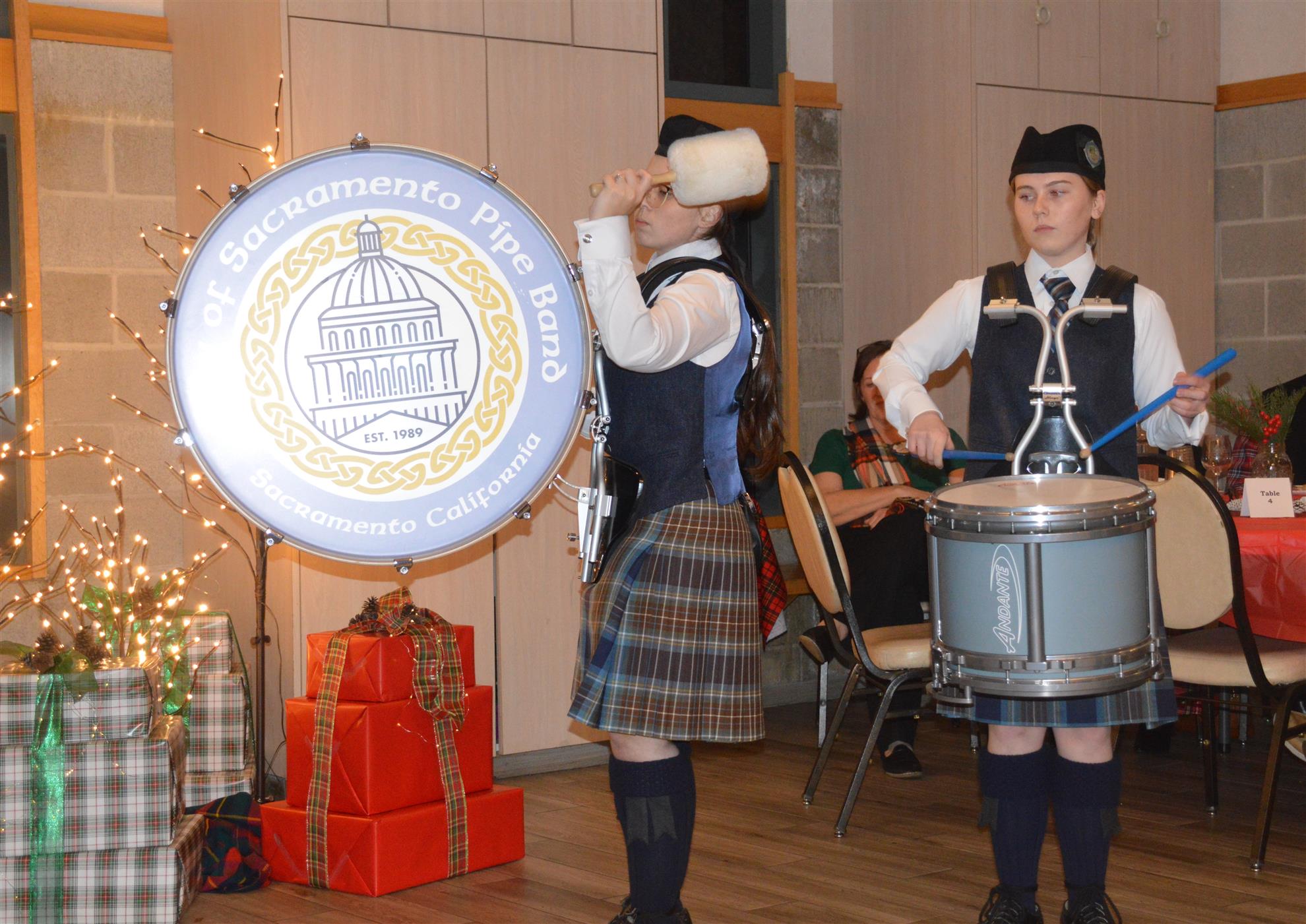Our meeting on December 18 was our annual Christmas Party. The theme was Scottish Holiday. Members were encouraged to wear their tartans. Entertainment was provided by members of the Sacramento City Pipe Band. After the band and dancers performed, the dancers showed members and guests how to do some Scottish dances.