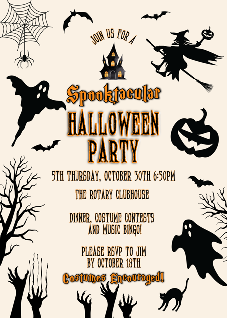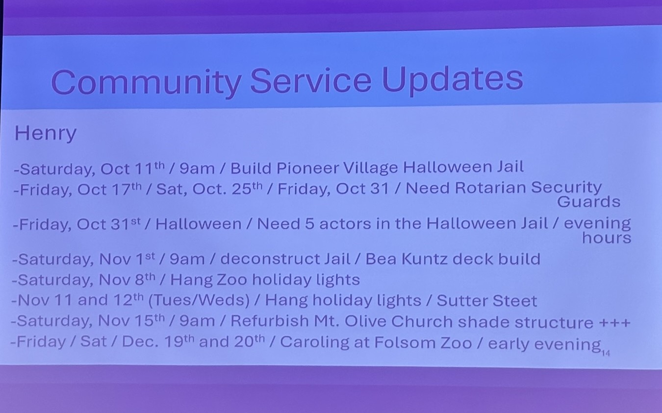 President Scott reminded the members about the 5th Thursday Party this month, October 30, at the Robert H. Miller III Folsom Rotary Clubhouse.