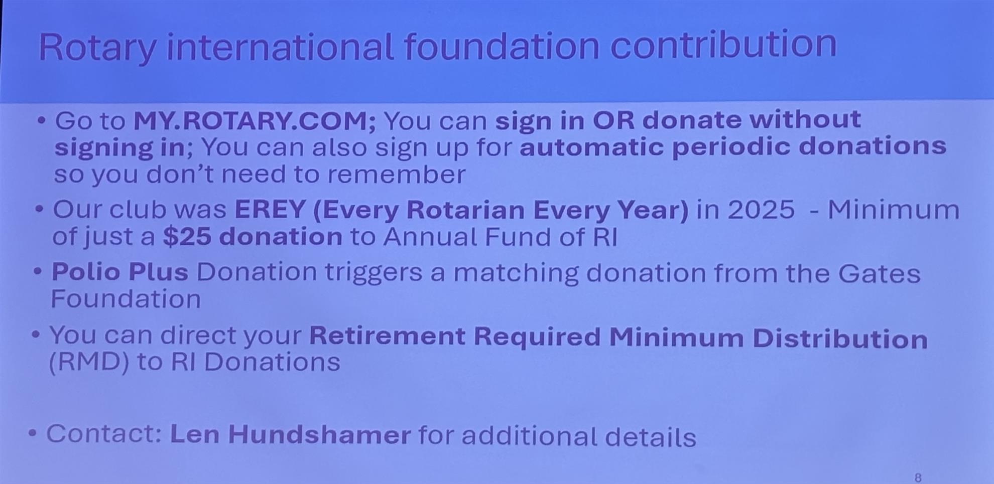 President Scott talked about The Rotary Foundation and how to make donations to The Foundation as follows: