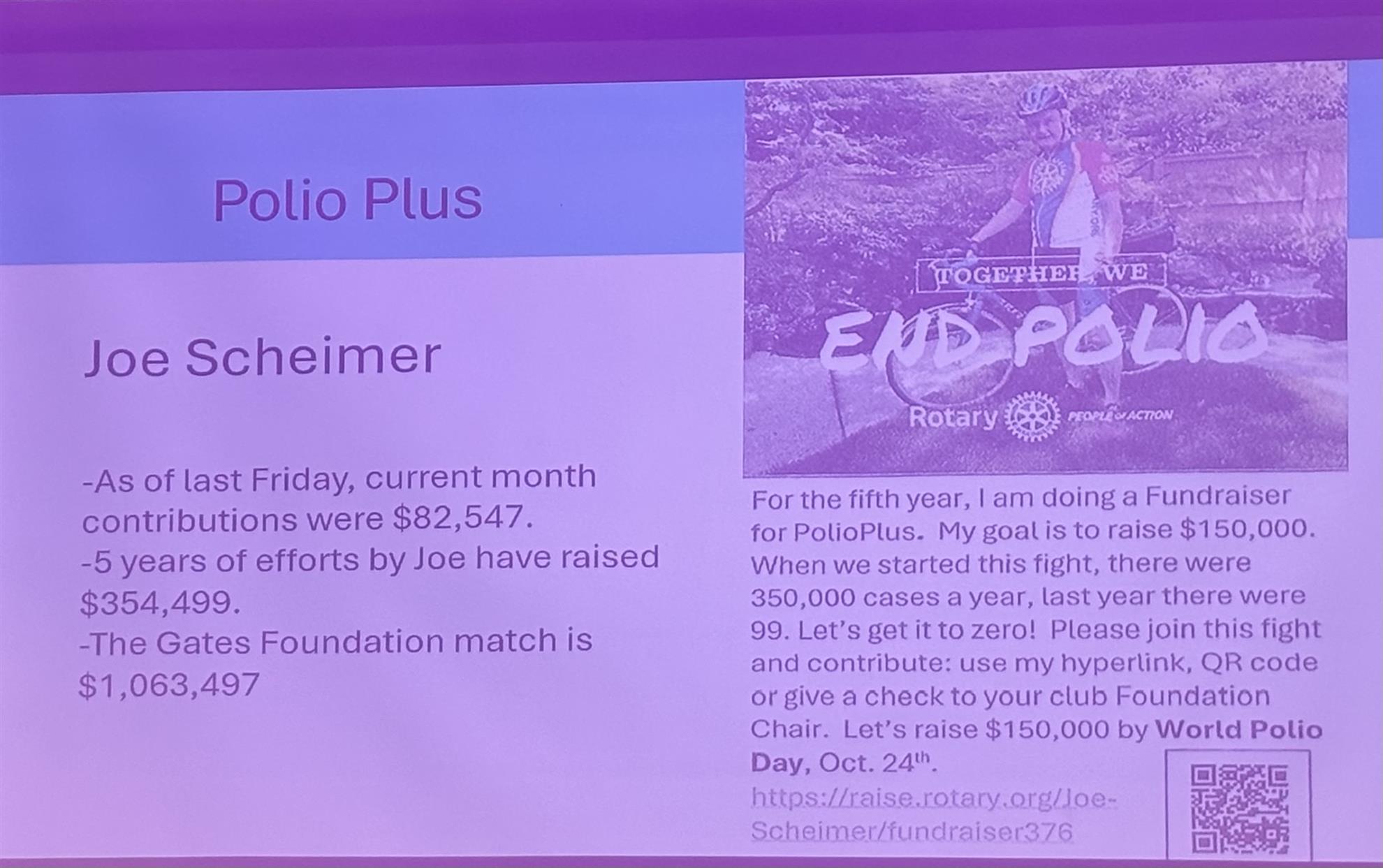 President Scott introduced Joe Scheimer, District 5180 Polio Plus Cyclist. Joe requested members to donate to Polio Plus at The Rotary Foundation as follows:
