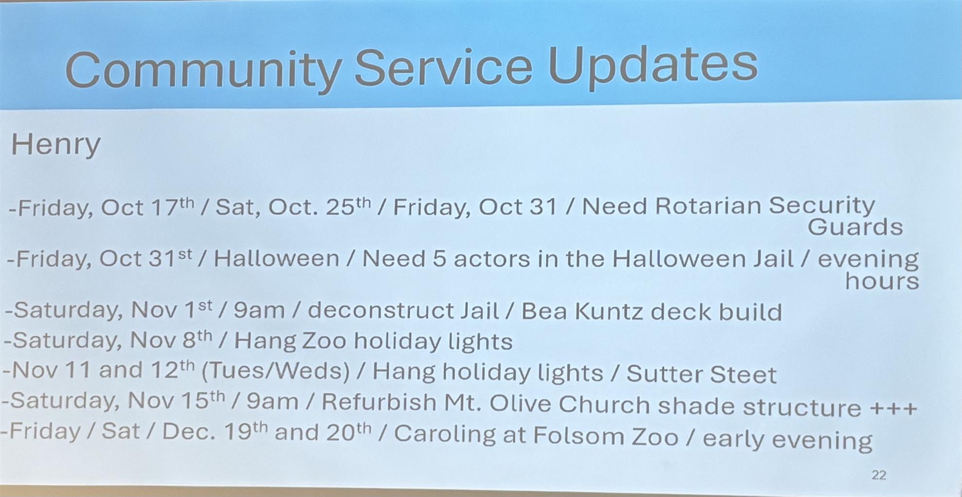 Henry Sundermier reviewed the schedule of community service projects through the end of the year. Included in the list are volunteer opportunities at the Halloween jail in Pioneer Village. If you can volunteer for the Halloween events, contact Henry.