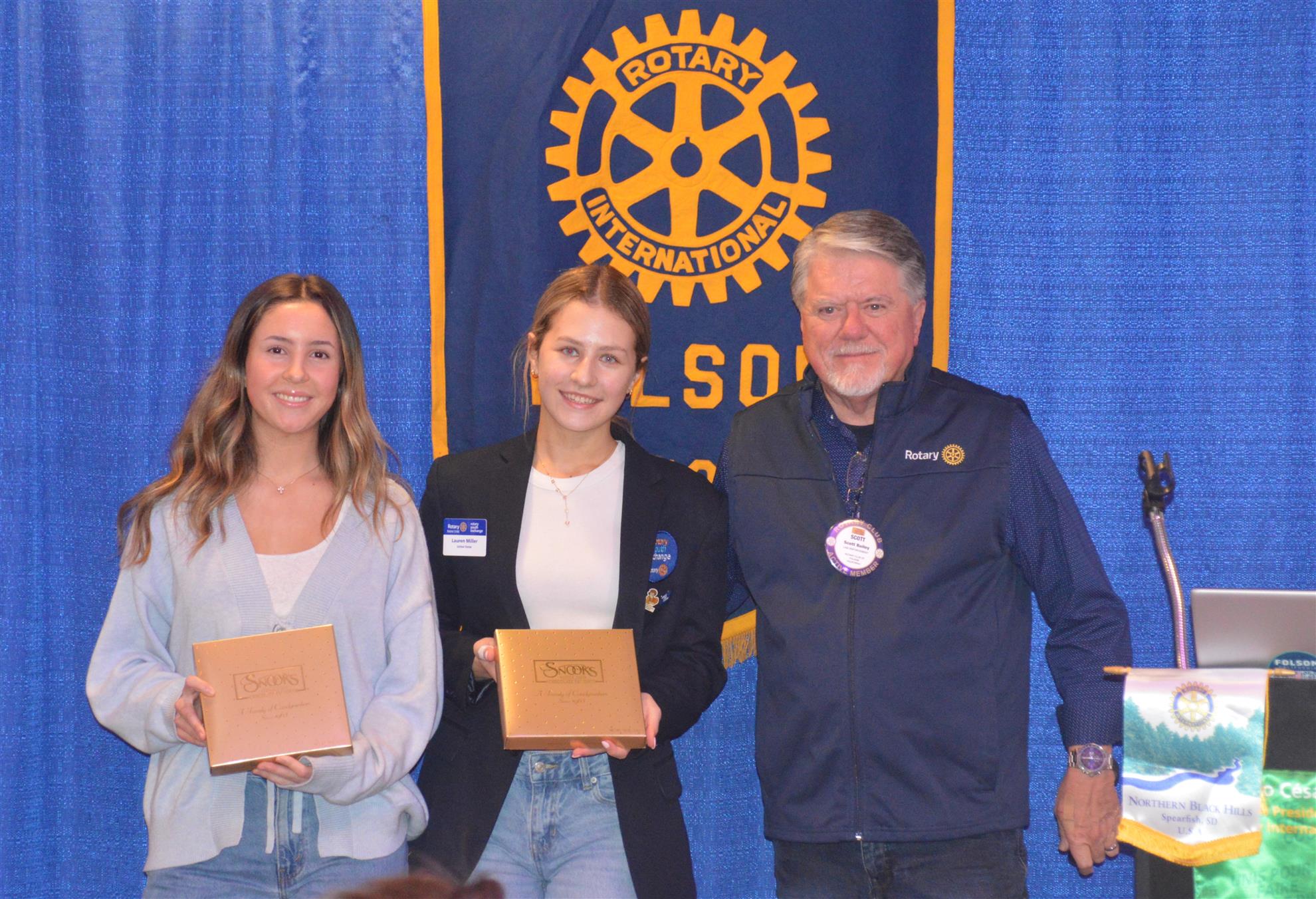 President Scott presented Sienna and Lauren with chocolates from Snook's that included a Rotary Wheel of chocolate in the box.