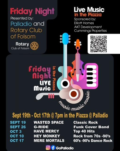 Friday Night Live Music at The Palladio: The Rotary Club of Folsom, in partnership with The Palladio, presents free live music in the Piazza every Friday night from September 19 through October 17, 2025 at 7 P.M. This week’s (September 19) performance features G-Ride, a funk cover band. Bring a chair, a friend, and your dancing shoes—because Rotary isn’t just about service, it’s also about community and fun!